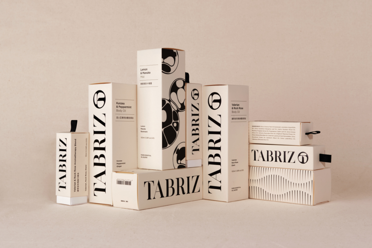 包裝形象延續品牌期望打造天然、有機的形象感受,選用FSC認證美術紙並取其色樣作為標準色,以直覺與簡約的風格呈現。意圖讓大眾從包裝體驗 TABRIZ 期望傳遞 “KEEP IT CLEAN AND SIMPLE” 的品牌精神。在印刷設計運用打凸及燙色的手法,加深標誌如水珠般透亮的識別概念印象,大面積將識別導入於產品系列包裝的同時,也助於消費市場對品牌識別的記憶度。