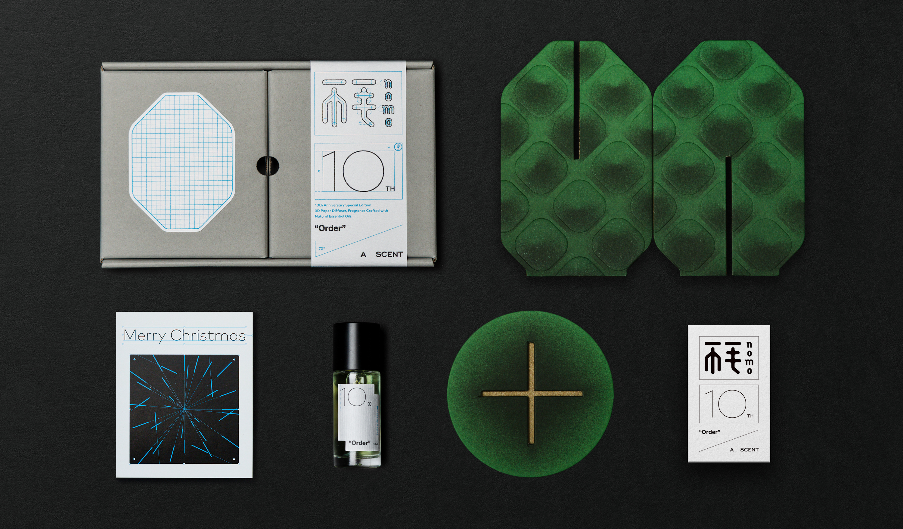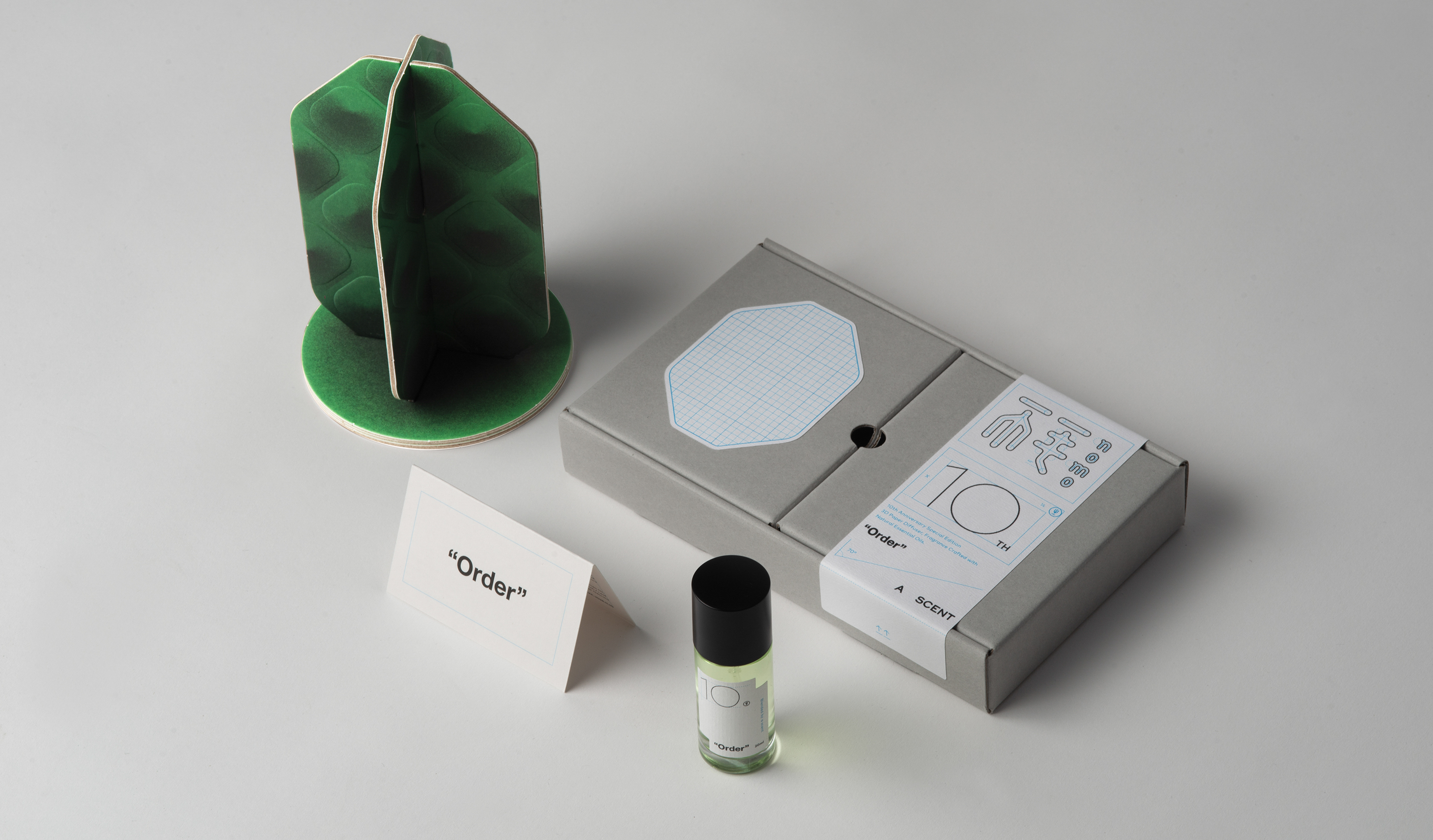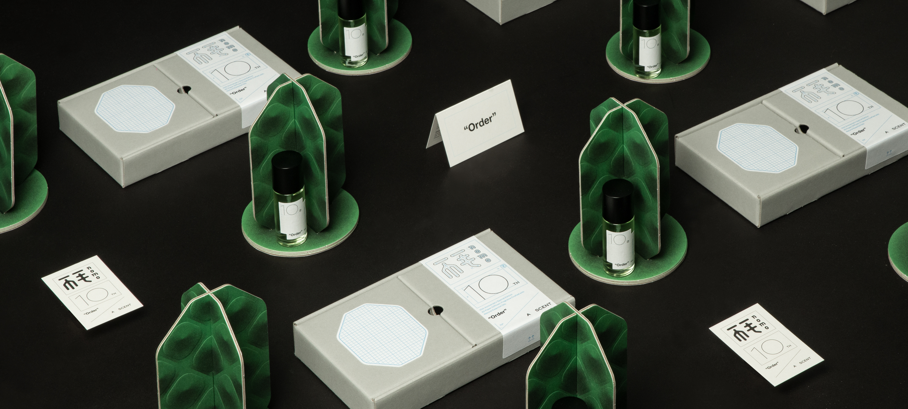 “Order” is a collaborative fragrance created through design and perfumery, conceived as a tenth-anniversary expression of sharing and gratitude. The packaging draws from the designer’s observations of points, lines, and planes, translating identity system drawings and usage guides into a renewed design language that redefines the aesthetics of order.